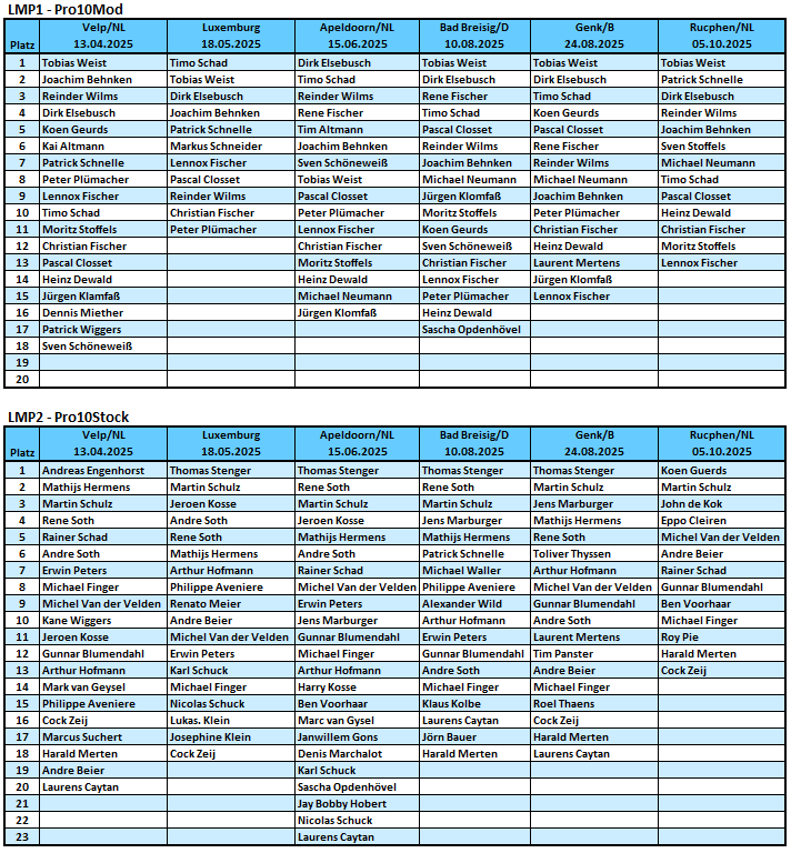2025 — Rennergebnisse Die Sieger LMP1 in 2025 Die Sieger LMP2 in 2025 Thomas Steger (Platz 1) und Rene Soth (Platz 3) waren in Rucphen/NL leider nicht anwesend.